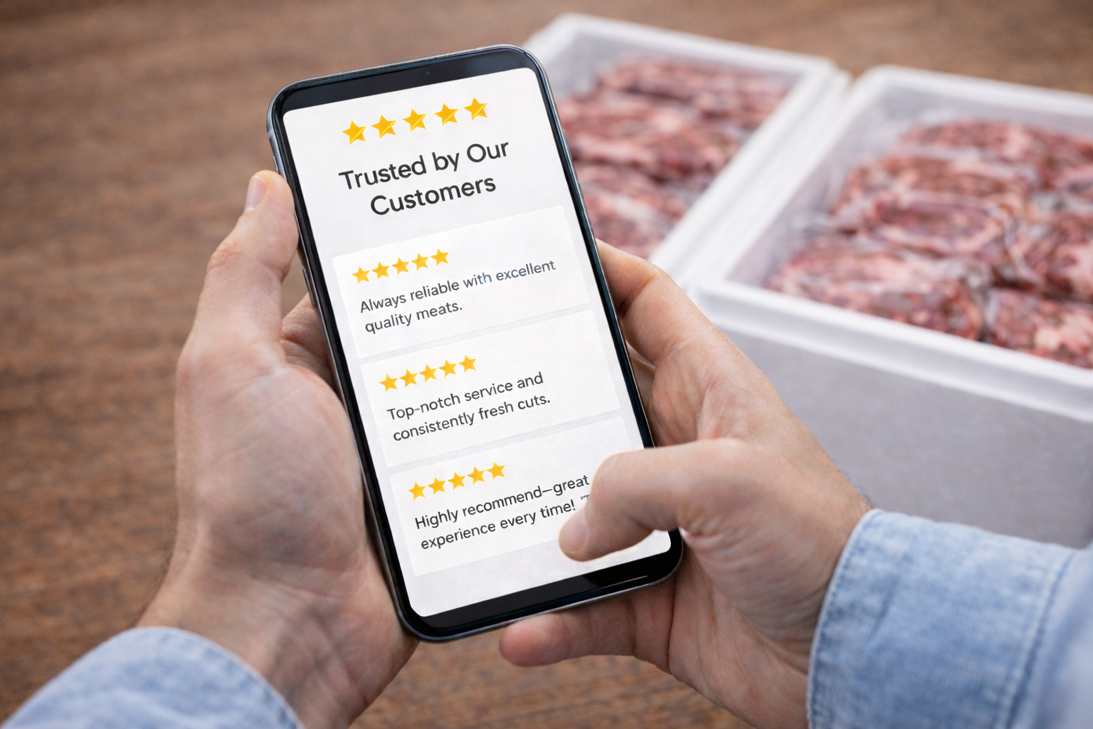 Every cut, from ribeye to lamb racks, is carefully selected and clearly defined. Premium beef and lamb, with total transparency.